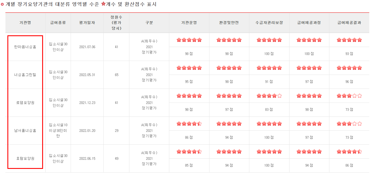 아래는 2021년 정기평가에서 A등급을 받은 대표 요양시설입니다.
