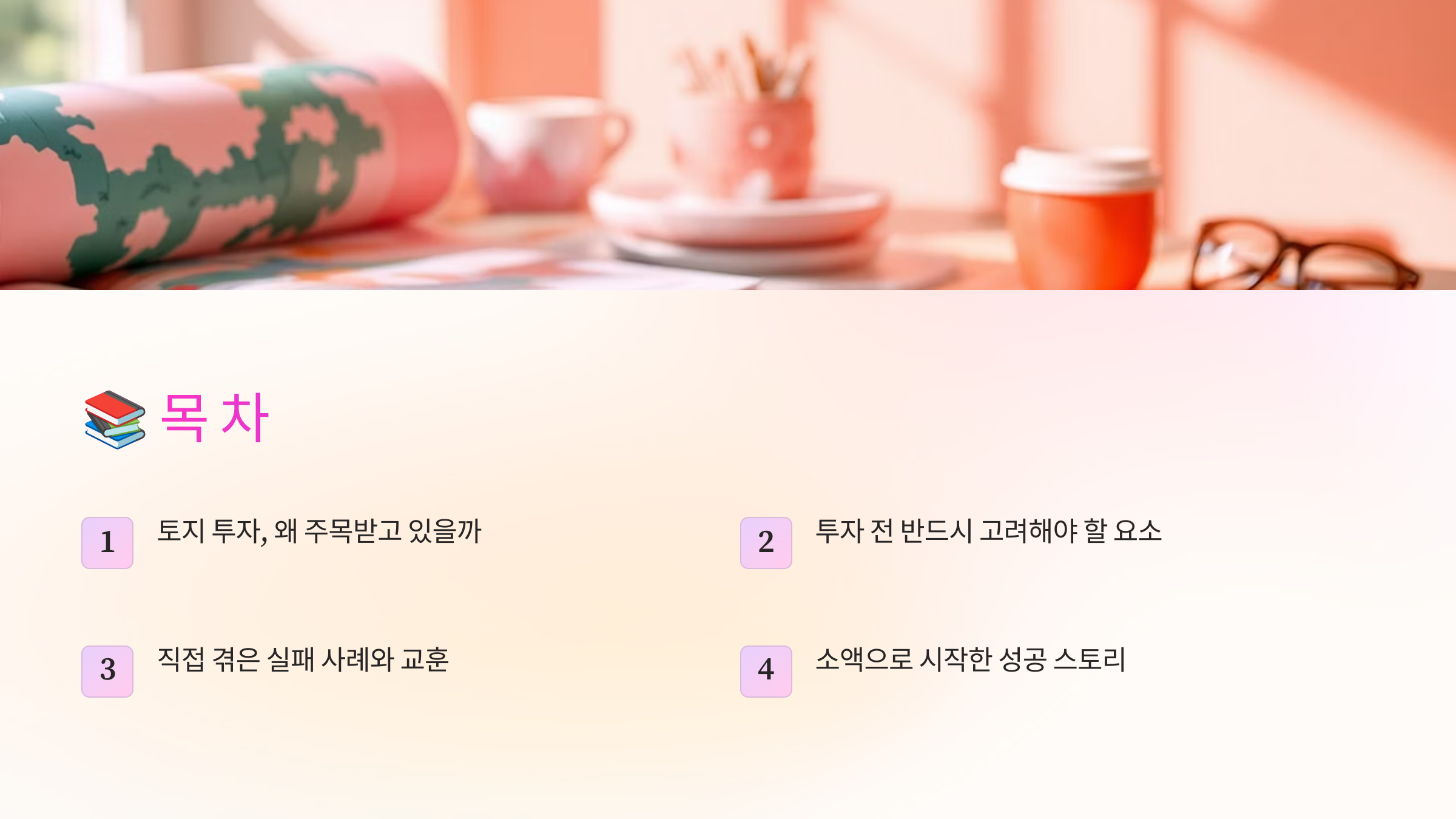 처음엔 낯설고 어려워 보였던 토지 투자. 하지만 하나하나 경험하면서 점점 확신이 생겼어요. 실패도 있었지만, 그것조차 값진 자산이 되었답니다. 여러분도 저처럼 작은 발걸음부터 시작해보세요. 언젠가 그 땅이 인생을 바꿔줄 수도 있어요!