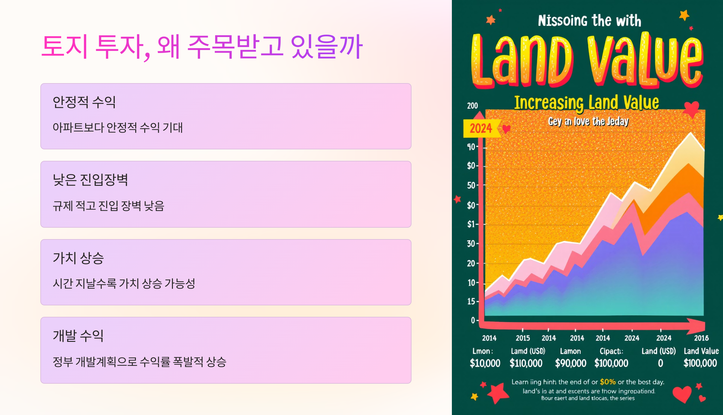 최근 부동산 시장이 불안정해지면서 아파트보다 안정적인 수익을 기대할 수 있는 토지 투자에 관심이 집중되고 있어요. 특히 규제가 적고 진입 장벽이 상대적으로 낮다는 점에서 매력적이죠. 토지는 실물 자산이라 시간이 지날수록 가치가 오를 가능성이 높고, 정부 개발 계획에 따라 수익률이 폭발적으로 오르기도 합니다. 실제로 최근 수도권 외곽 개발지 인근 토지를 매입한 분들은 짧은 시간 안에 두 배 이상의 시세차익을 경험하기도 했답니다.