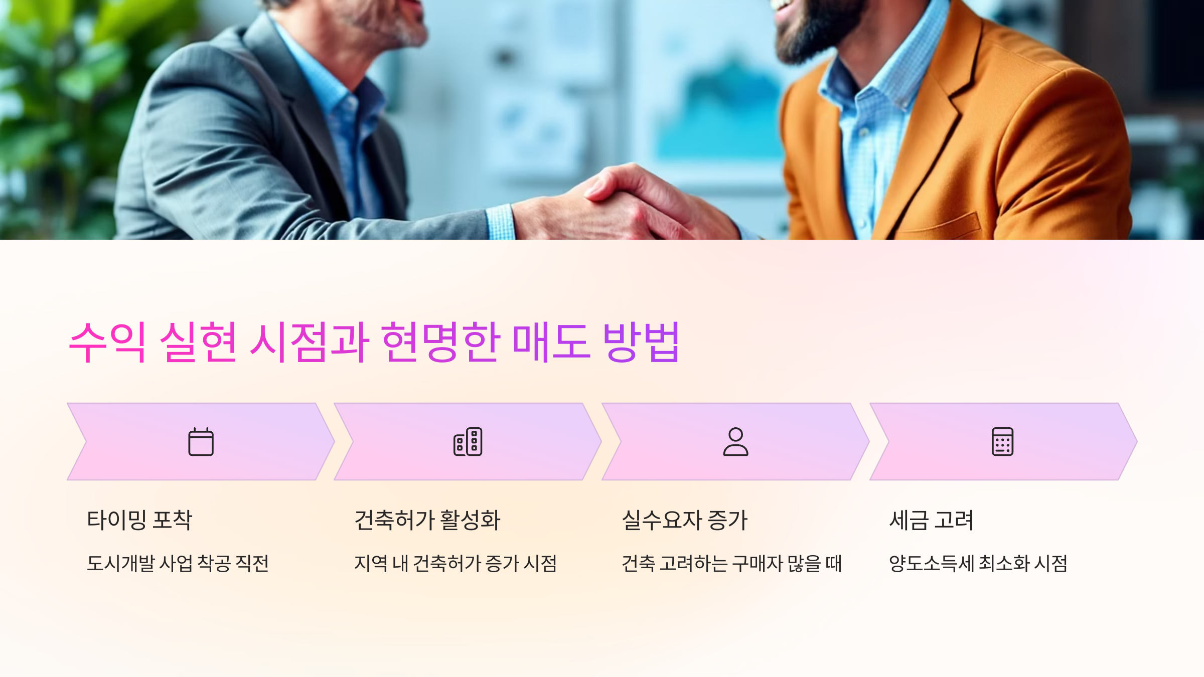 토지는 너무 오래 가지고만 있어도 기회비용이 생기기 때문에 수익 실현 시점을 잘 잡는 게 중요해요. 저는 보통 도시개발 사업 착공 직전이나 해당 지역에 건축허가가 활발하게 나는 시점을 매도 타이밍으로 봅니다. 이때는 이미 가치가 상승해 있는 상태고, 실수요자나 건축을 고려하는 사람들이 많기 때문에 매각도 원활하죠. 특히 세금 측면에서도 양도소득세를 고려해 보유 기간을 조절하는 것도 전략 중 하나예요.
