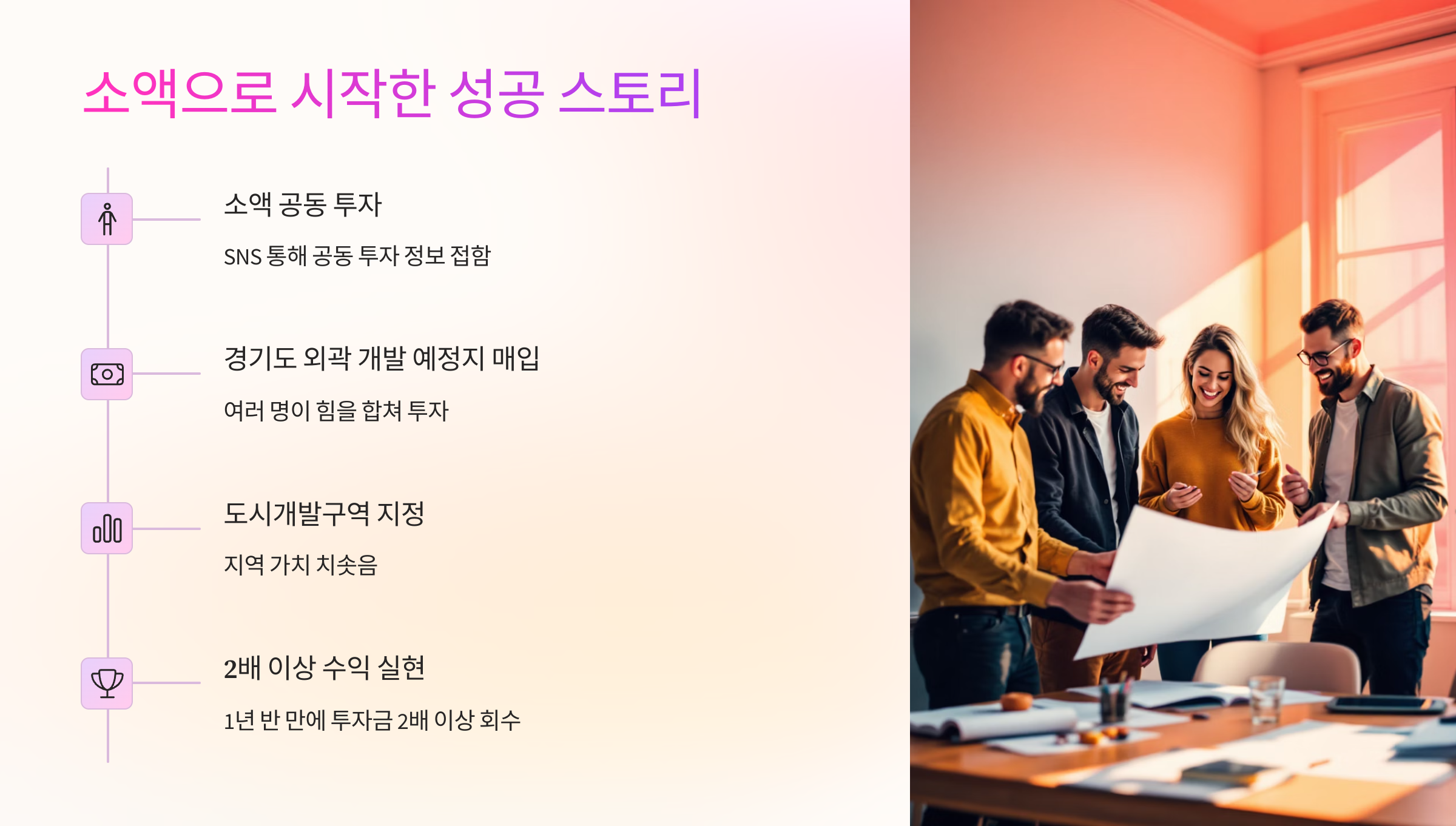 처음엔 큰돈 없이도 투자할 수 있을까 고민이 많았어요. 그런데 어느 날 SNS를 통해 소액 공동 투자 정보를 접했고, 몇 명이서 힘을 합쳐 경기도 외곽의 개발 예정지를 매입했죠. 얼마 안 가 해당 지역이 도시개발구역으로 지정되면서 가치가 치솟았고, 1년 반 만에 2배 이상의 수익을 얻을 수 있었어요. 이 경험은 저 같은 초보 투자자에게도 가능성이 있다는 걸 보여줬고, 적은 자본으로도 시작할 수 있는 방법이 있다는 걸 알게 해줬어요.