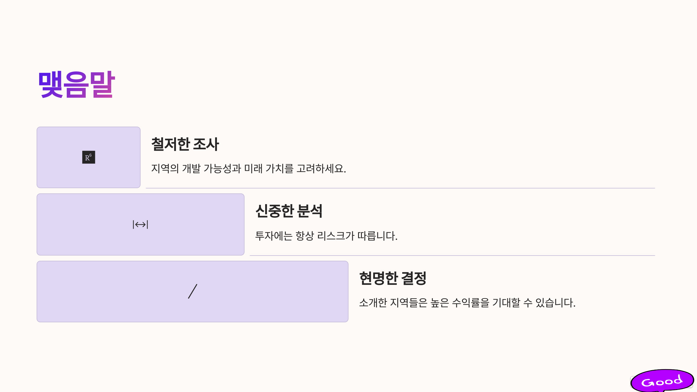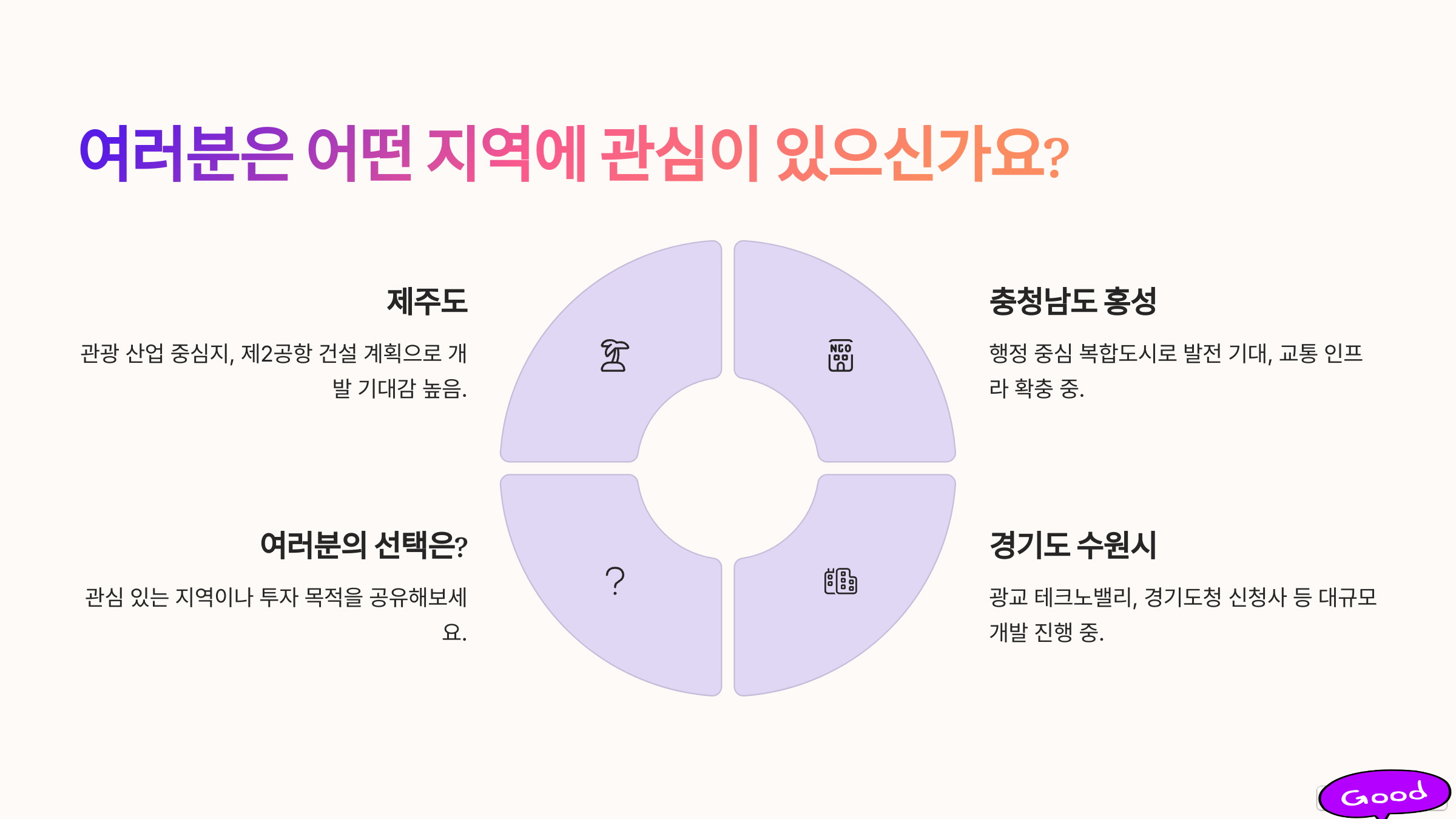- 투자 포인트: 제2공항 예정지 주변이나 관광지 인근의 토지를 고려해보세요. 중장기적으로 안정적인 수익을 기대할 수 있습니다.