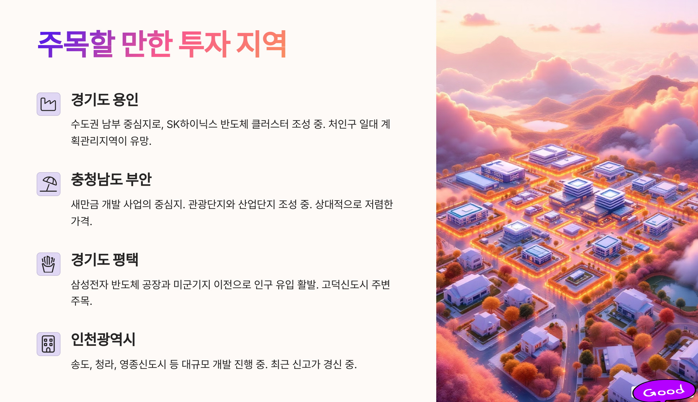 - 투자 포인트: 처인구 일대의 계획관리지역이나 개발 예정지 주변의 토지를 주목해보세요. 향후 산업단지와 연계된 수요 증가가 예상됩니다.
