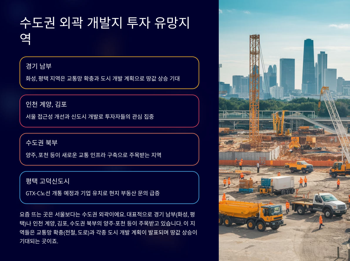 대표적으로 경기 남부(화성, 평택)나 인천 계양, 김포, 수도권 북부의 양주·포천 등이 주목받고 있습니다. 이 지역들은 교통망 확충(전철, 도로)과 각종 도시 개발 계획이 발표되며 땅값 상승이 기대되는 곳이죠.