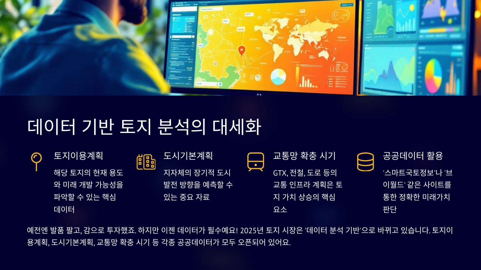 2025년 토지 시장은 ‘데이터 분석 기반’으로 바뀌고 있습니다. 토지이용계획, 도시기본계획, 교통망 확충 시기 등 각종 공공데이터가 모두 오픈되어 있어요.