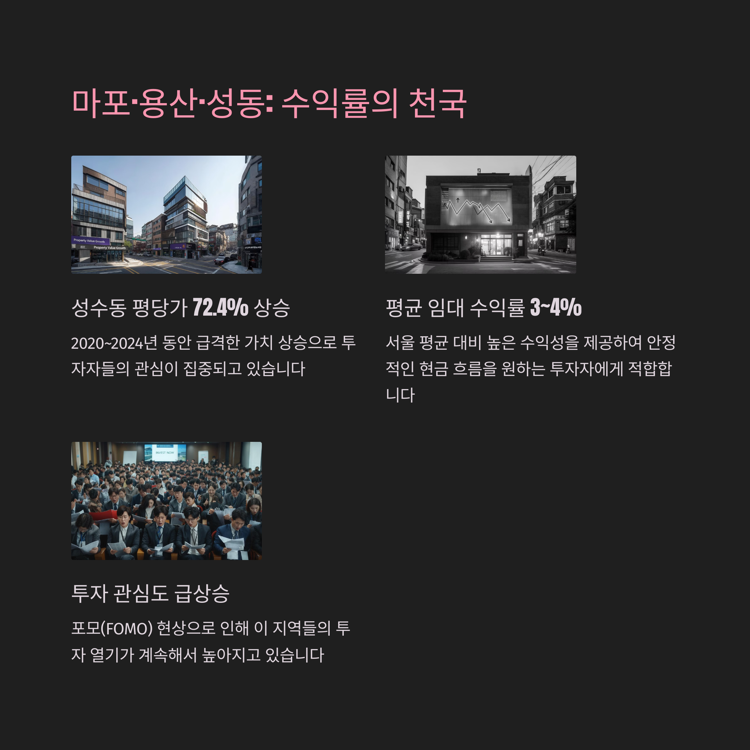 마포구, 용산구, 성동구는 최근 몇 년간 투자자들의 관심이 급증한 지역입니다. 특히 성수동과 이태원 일대는 개발 호재와 함께 상권이 활성화되면서 꼬마빌딩 거래가 활발히 이루어지고 있습니다. 비교적 낮은 매입가와 높은 임대 수익률(3~4%)로 인해 투자 매력이 높습니다. 🌟